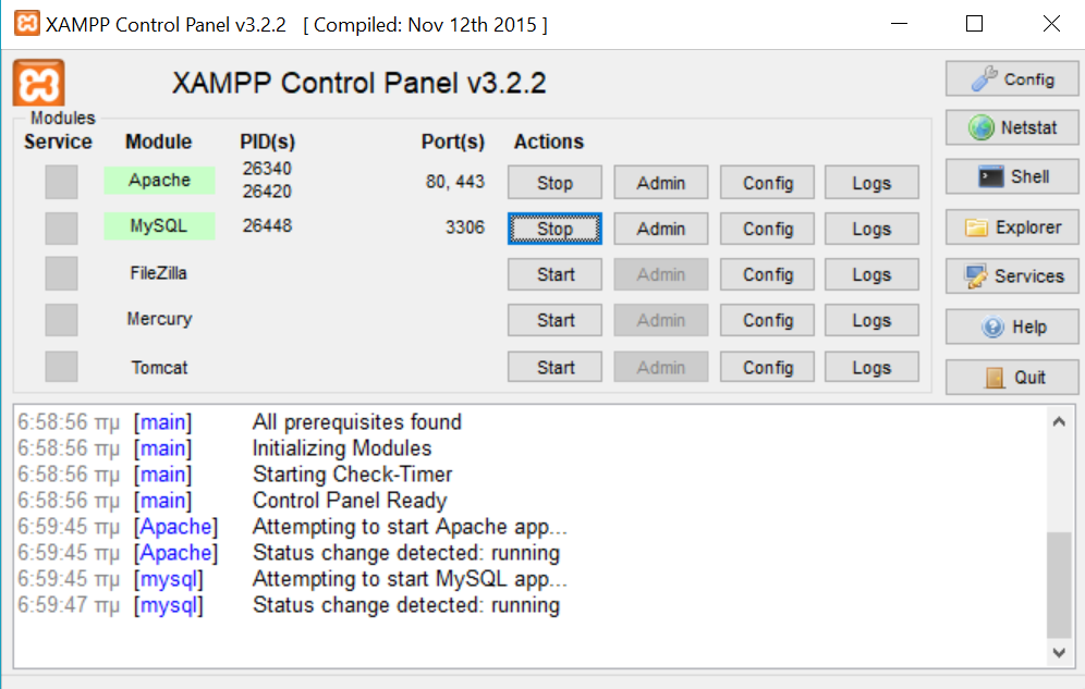 Αφού εγκαταστήσουμε το πρόγραμμα στον υπολογιστή μας επιτυχώς, αναζητούμε το φάκελο htdocs από το σκληρό δίσκο C και το φάκελο xamp και το μεταφέρουμε στην επιφάνεια εργασίας μας, προκειμένου να εγκαταστήσουμε εκεί το φάκελο της ιστοσελίδας μας για το Wordpress. Στη συνέχεια, τρέχουμε το πρόγραμμα του xampp και πατάμε στα δύο πλήκτρα του XAMPP Control Panel Start για Apache και Start για MySQL.