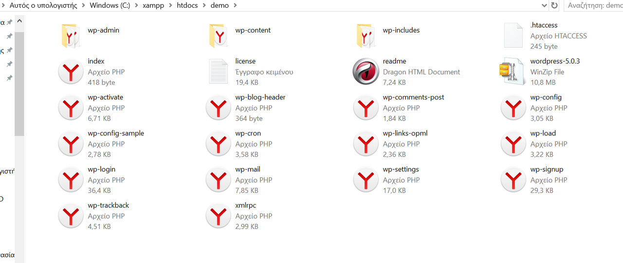 Τώρα, δημιουργούμε ένα φάκελο με την ονομασία demo μέσα στο htdocs και μεταφέρουμε το συμπιεσμένο αρχείο του Wordpress εκεί. Το αποσυμπιέζουμε και μεταφέρουμε όλα τα αρχεία και τους φακέλους από τον υποφάκελο που δημιουργείται στο φάκελο demo, ώστε να είναι άμεσα προσβάσιμα. Πλέον, δε χρειαζόμαστε το συμπιεσμένο αρχείο.