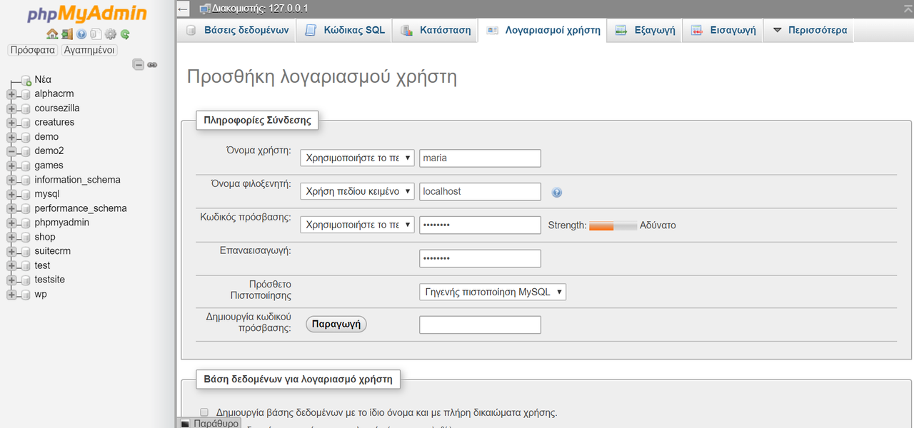 Στη συνέχεια, πατάμε Προσθήκη Λογαριασμού Χρήστη κάτω, όπως φαίνεται στην εικόνα που ακολουθεί και καταχωρούμε το όνομα χρήστη (π.χ. maria), όνομα φιλοξενητή localhost (καθώς η ιστοσελίδα θα τρέχει αρχικά τοπικά στον υπολογιστή μας) και δίνουμε έναν κωδικό στο password και τον επιβεβαιώνουμε, προκειμένου να συνδεόμαστε.