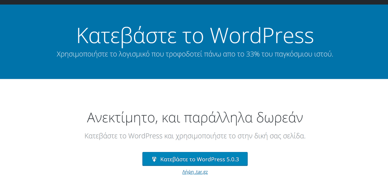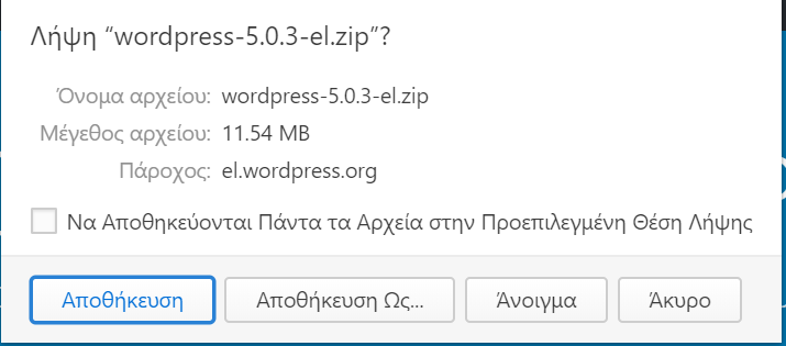 Ξεκινώντας, λοιπόν, τη διαδικασία εγκατάστασης, μεταβαίνουμε στην ιστοσελίδα του el.wordpress.org και πατάμε στο πλήκτρο "Κατεβάστε το Wordpress". Έπειτα, πατάμε στο πλήκτρο "Κατεβάστε το WordPress 5.0.3" και αποθηκεύουμε στο φάκελο λήψεων του φυλλομετρητή μας σε συμπιεσμένη μορφή, όπως φαίνεται στις εικόνες που ακολουθούν.