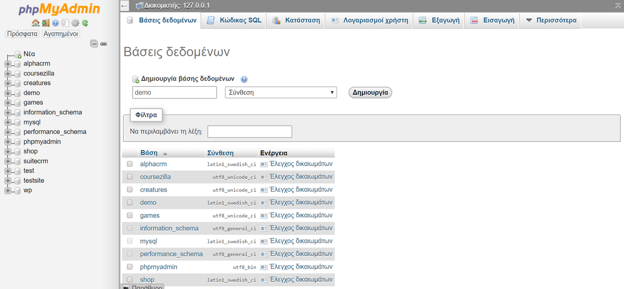 Πατάμε Βάσεις Δεδομένων και πληκτρολογούμε για όνομα demo και δημιουργία.