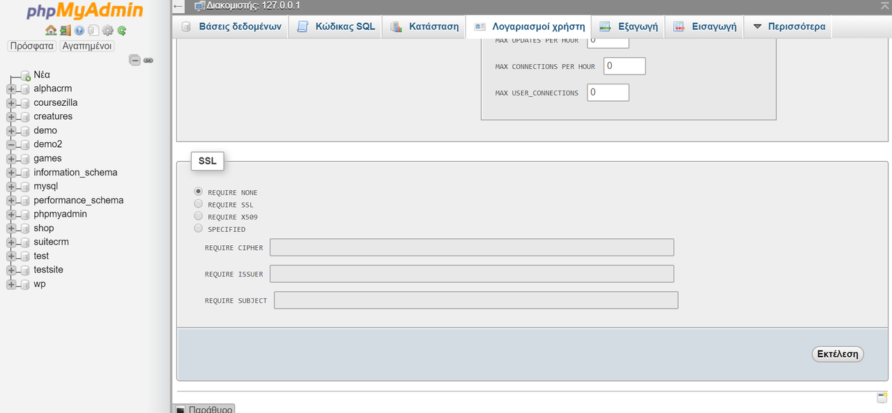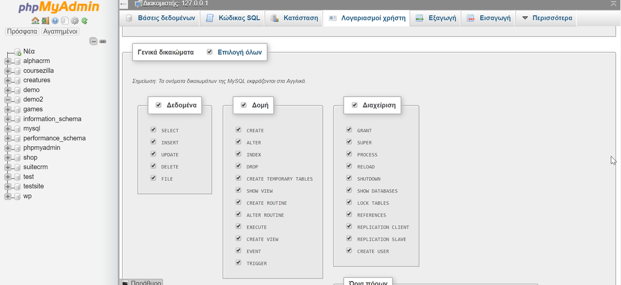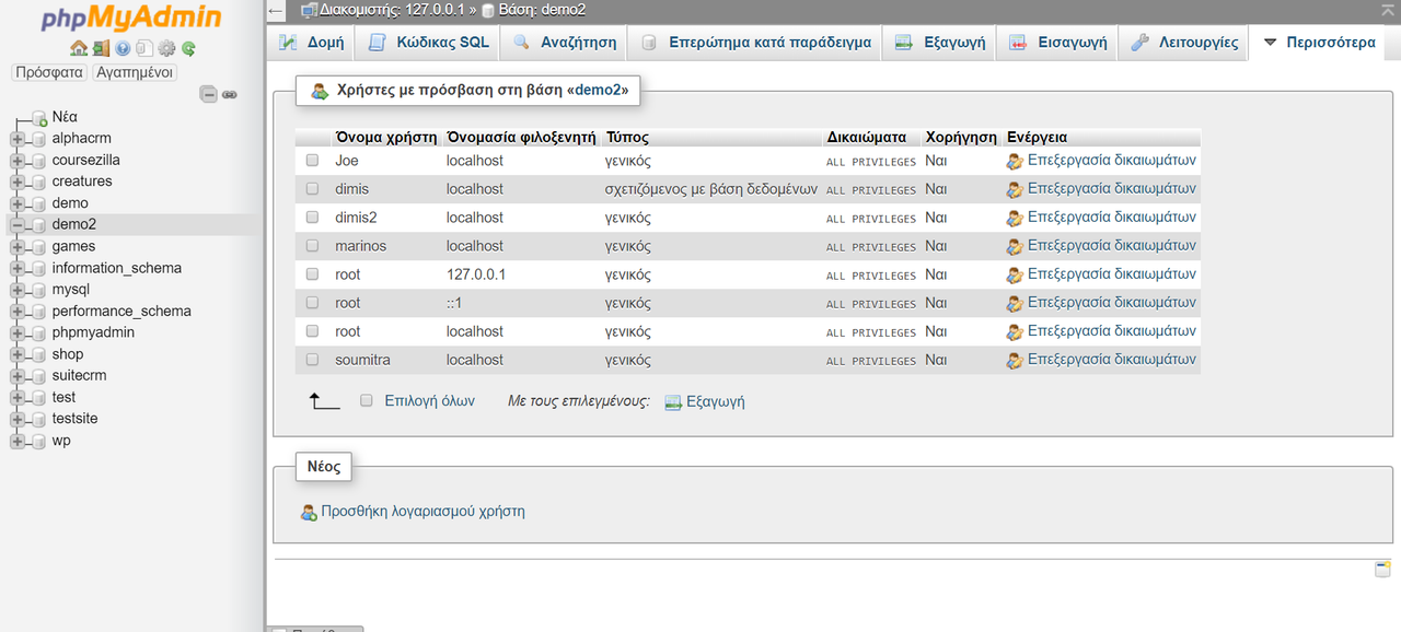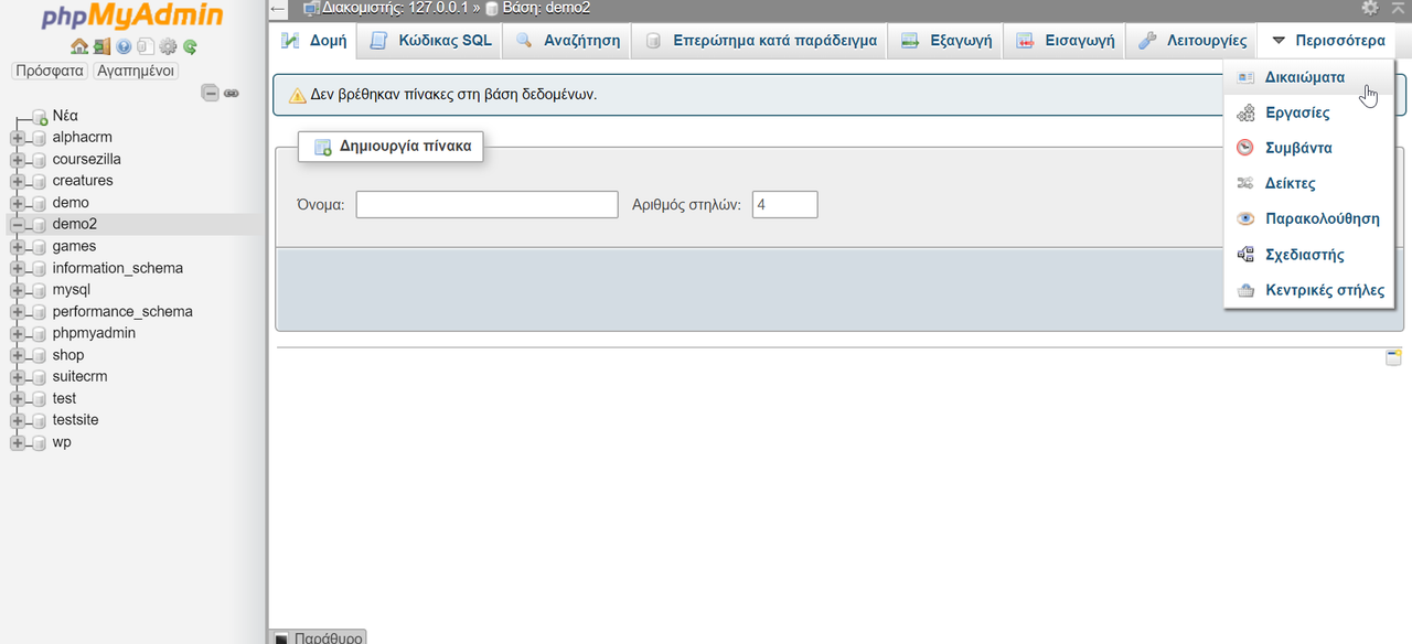 Αφού δημιουργήσαμε τη βάση δεδομένων, πάμε να δημιουργήσουμε ένα χρήστη. Πάμε στην επιλογή Περισσότερα και πατάμε Δικαιώματα (Privilegies).